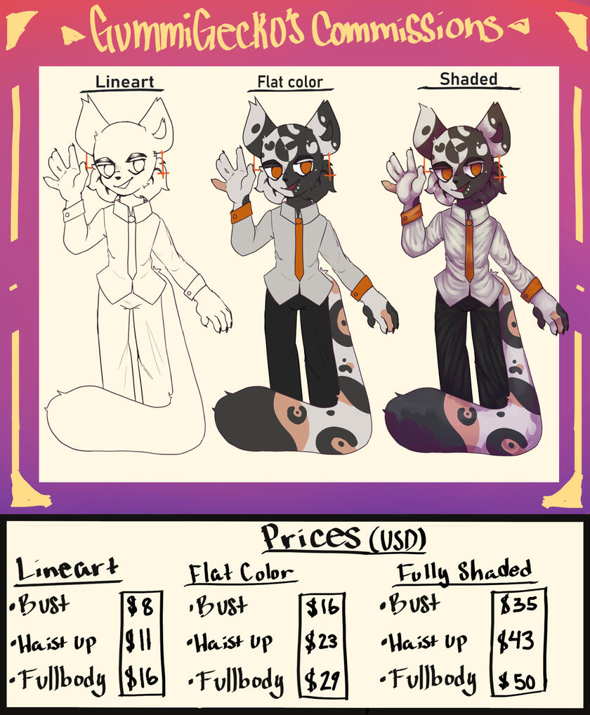 Hello, I'm Gummi and welcome to my commission Page. Any questions you may have about my commissions should be answered here but if you have any other questions don't hesitate to DM me on Twitter.